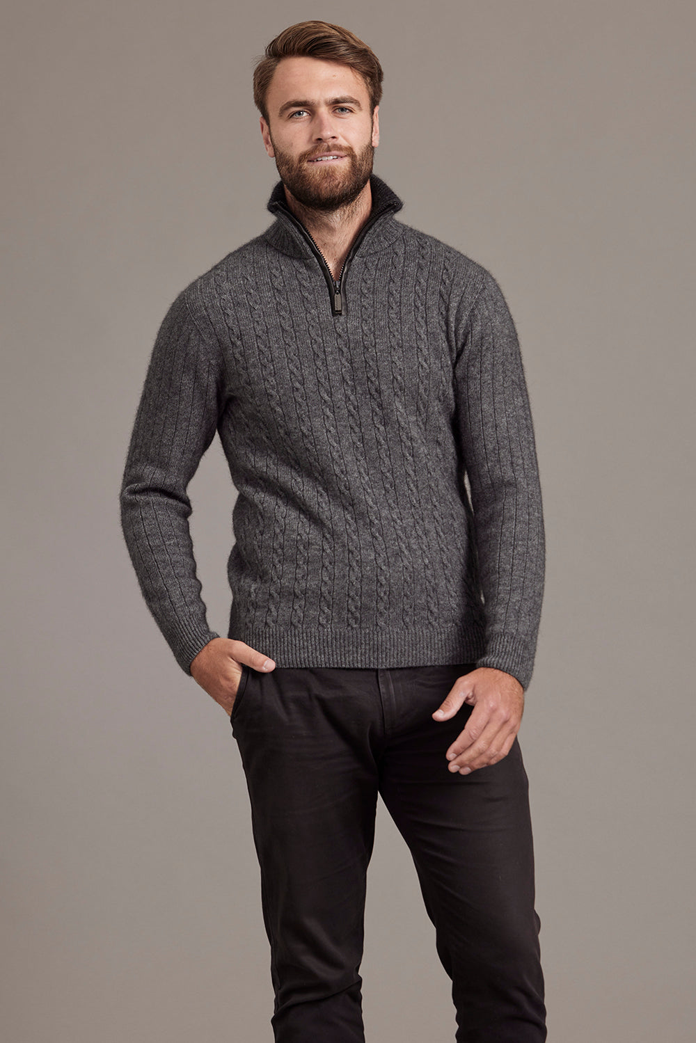 As one of our best-selling styles, this short zip jersey is a classic style to take you to where you're headed. This cable knit has a striking contrast trim inside the collar. Tackle any quest wrapped in quality natural fibres of Possum Merino and Mulberry silk.