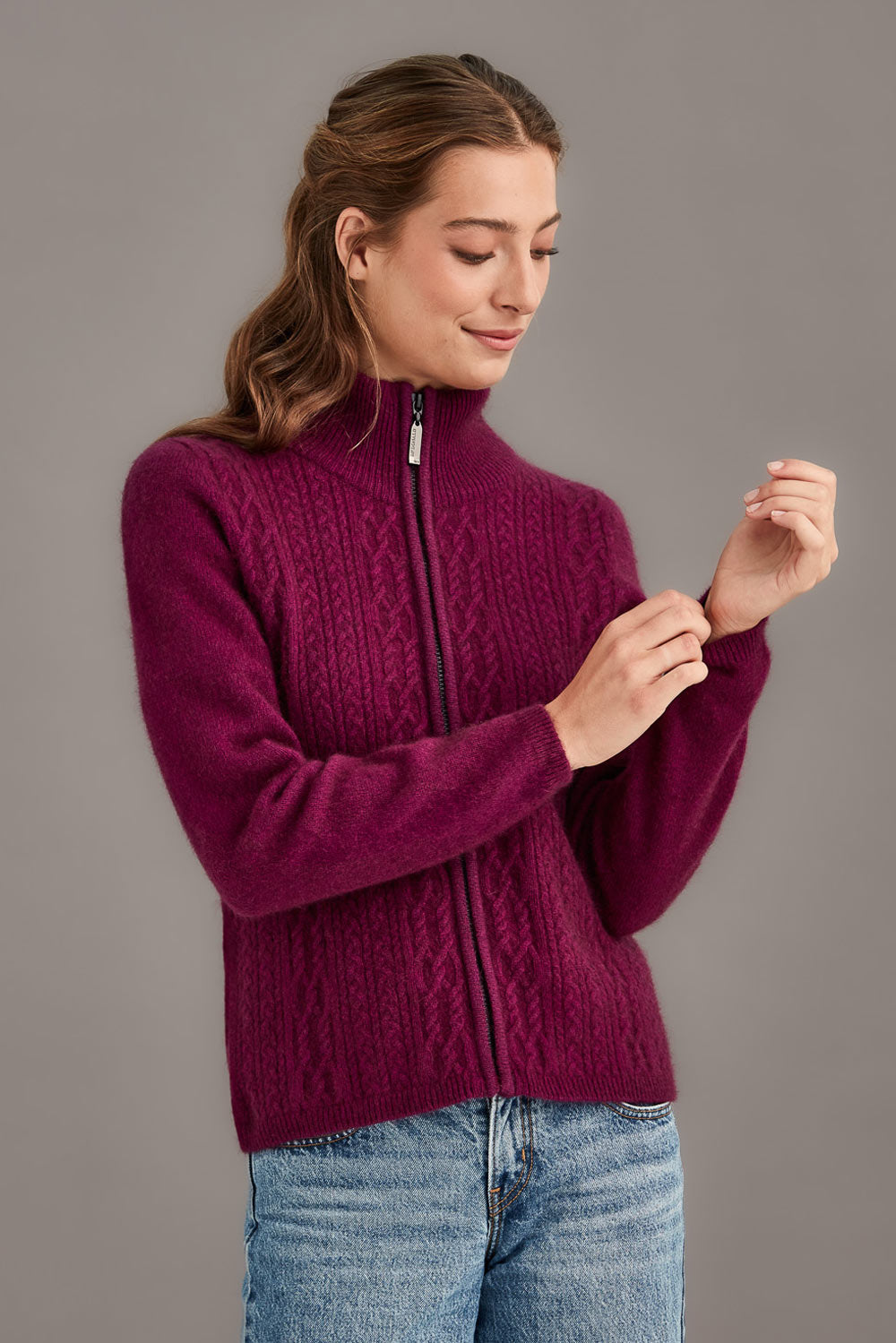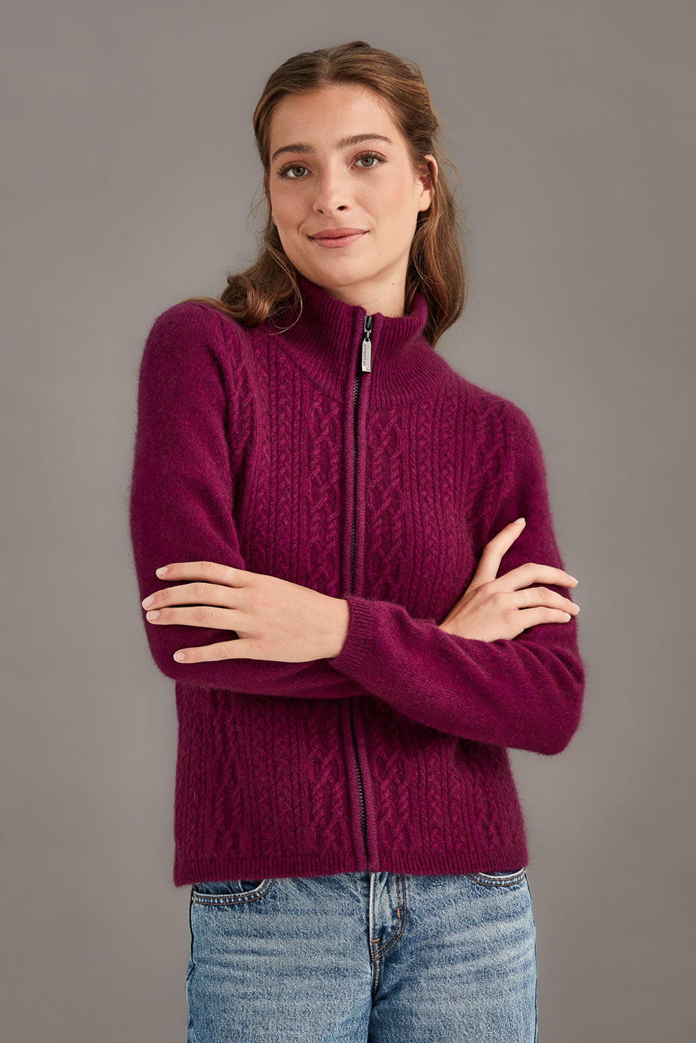 So versatile and easy to wear, this zip-up jacket features delicate and feminine cable detailing. The pattern is the hero of this stunning jacket and the high neckline adds an elegant touch. The fit is slightly relaxed through the body for comfort, and the full zip styling allows versatility to wear on it's own, or unzipped as a layering piece.