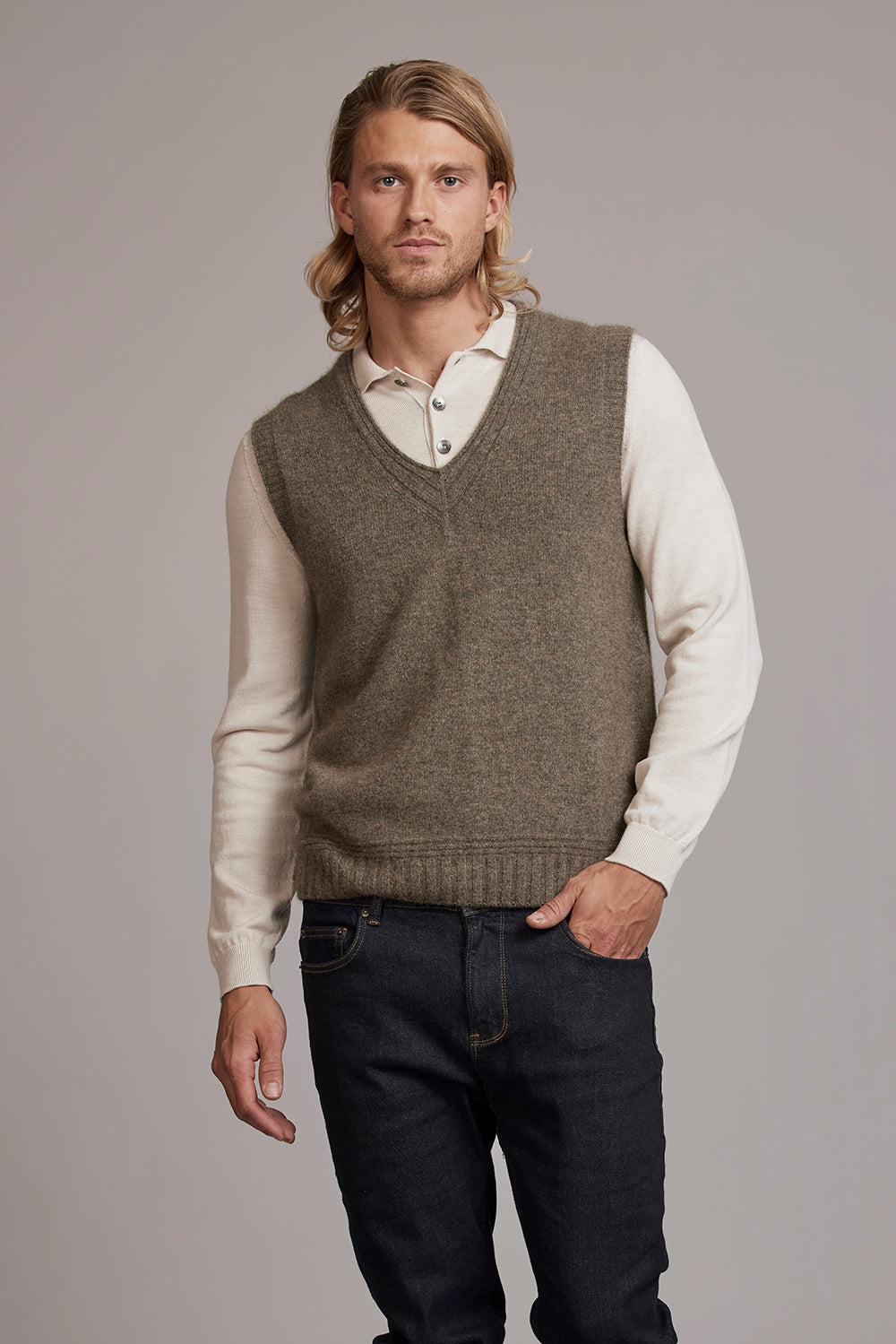A classic vest with finely knit ridge neck detailing made by McDonald. The blend of natural Merino, Possum fur and Silk fibres will ensure the cold never gets past this classic layering piece. Hold onto this sumptuous vest and don’t let go until the mercury rises.