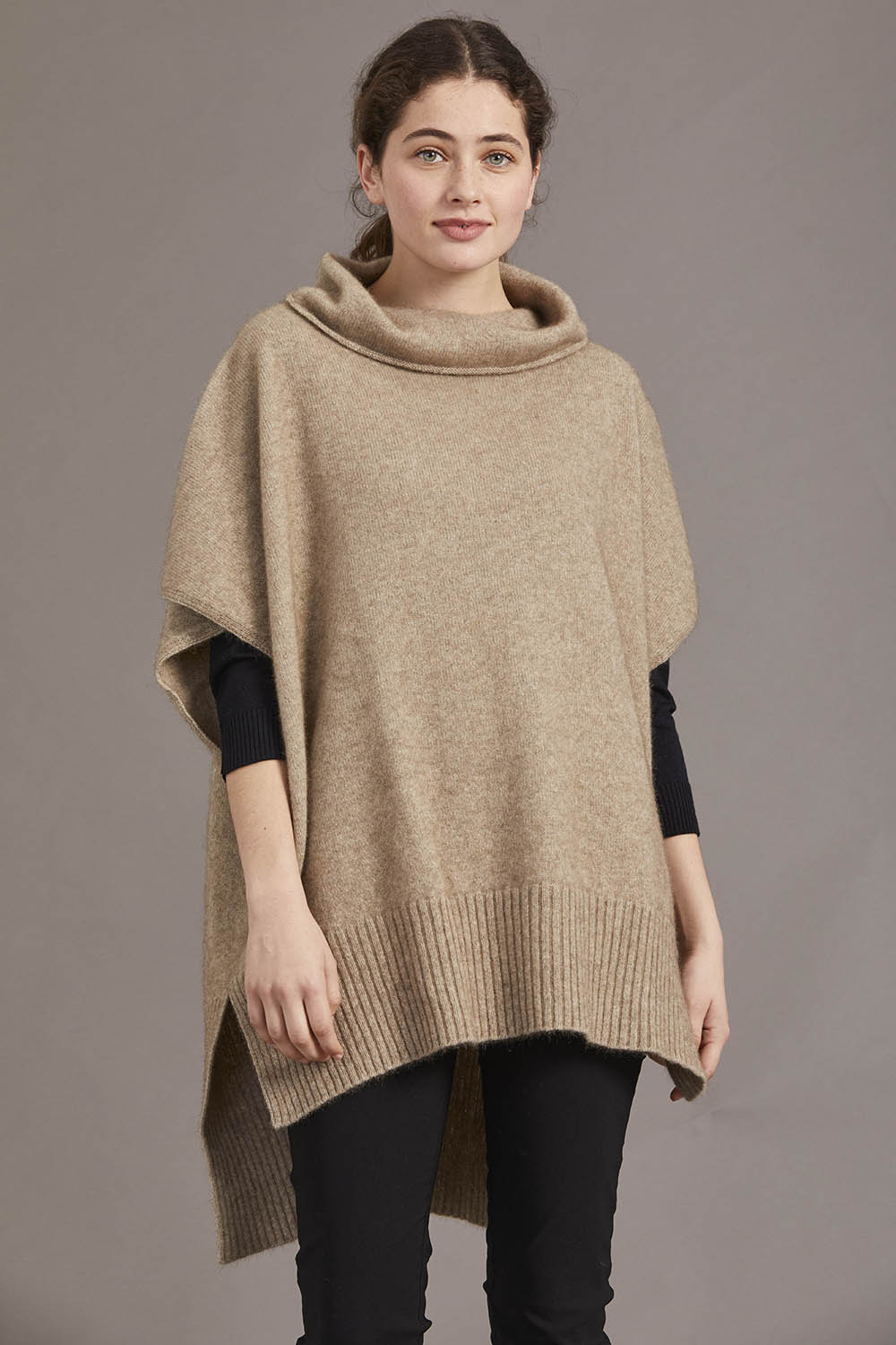 This comfortable and flattering poncho made by McDonald is available in three versatile neutral colour options. A step level hem and a small cowl neck set this poncho apart from the rest, and keep you warm in style. Can be worn loose or cinched with a belt of your choosing.